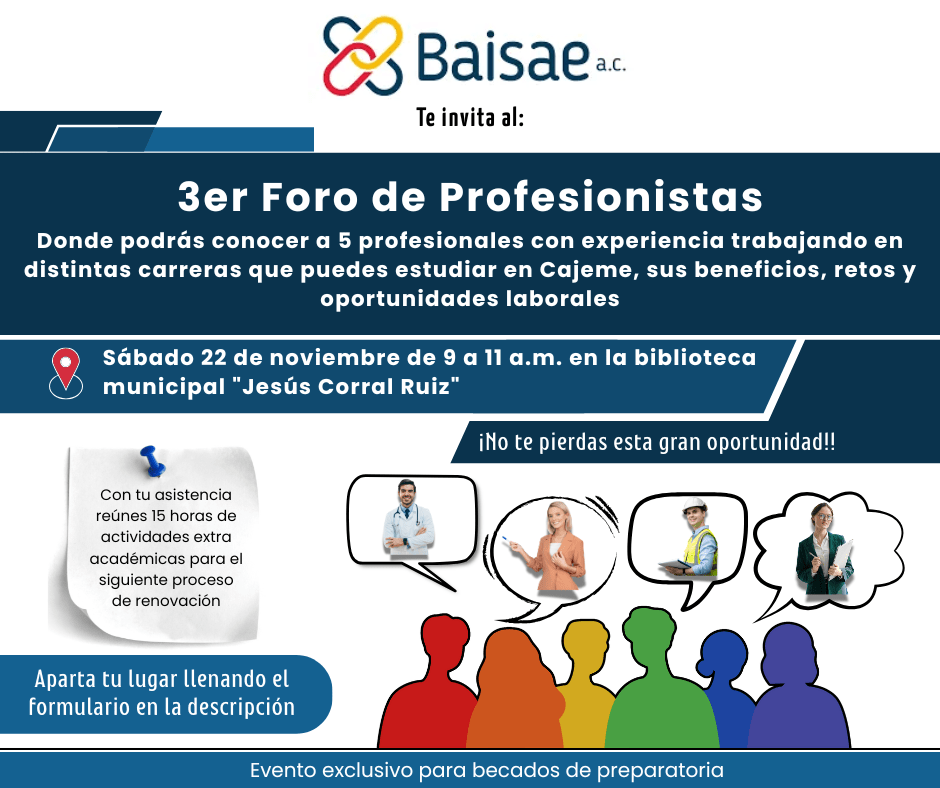 BAISAE te invita al 3er Foro de Profesionistas, un espacio diseñado especialmente para ti, estudiante becado de preparatoria.